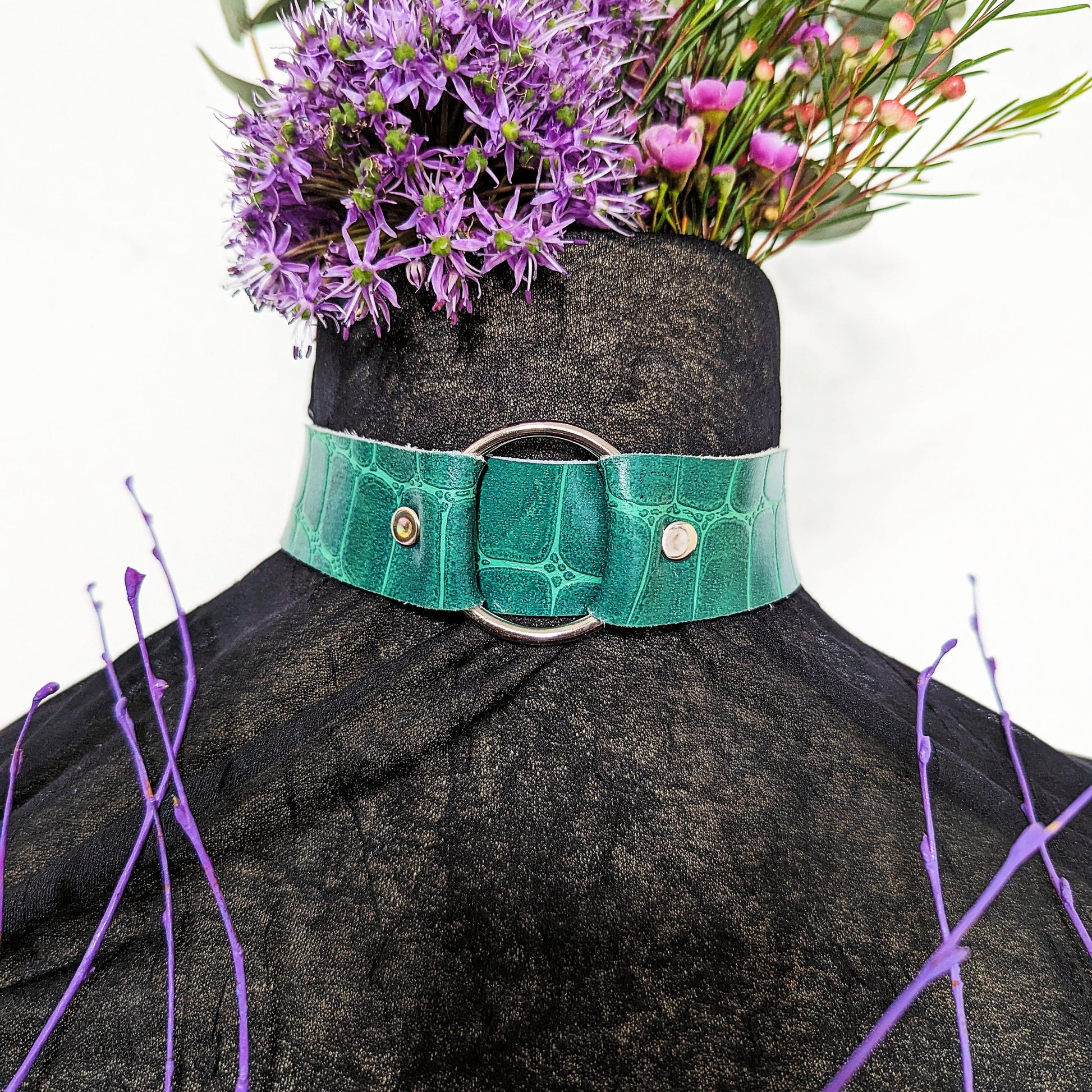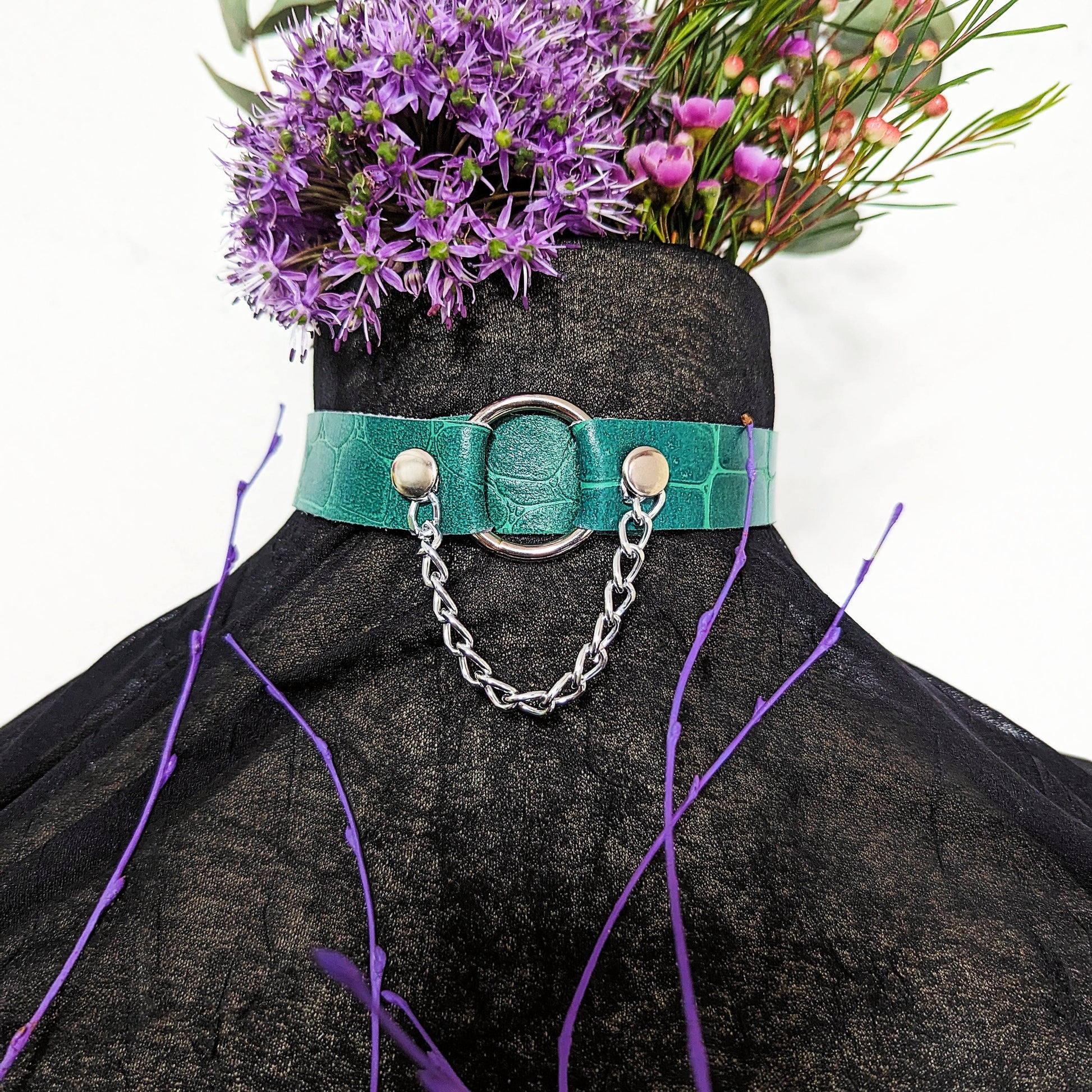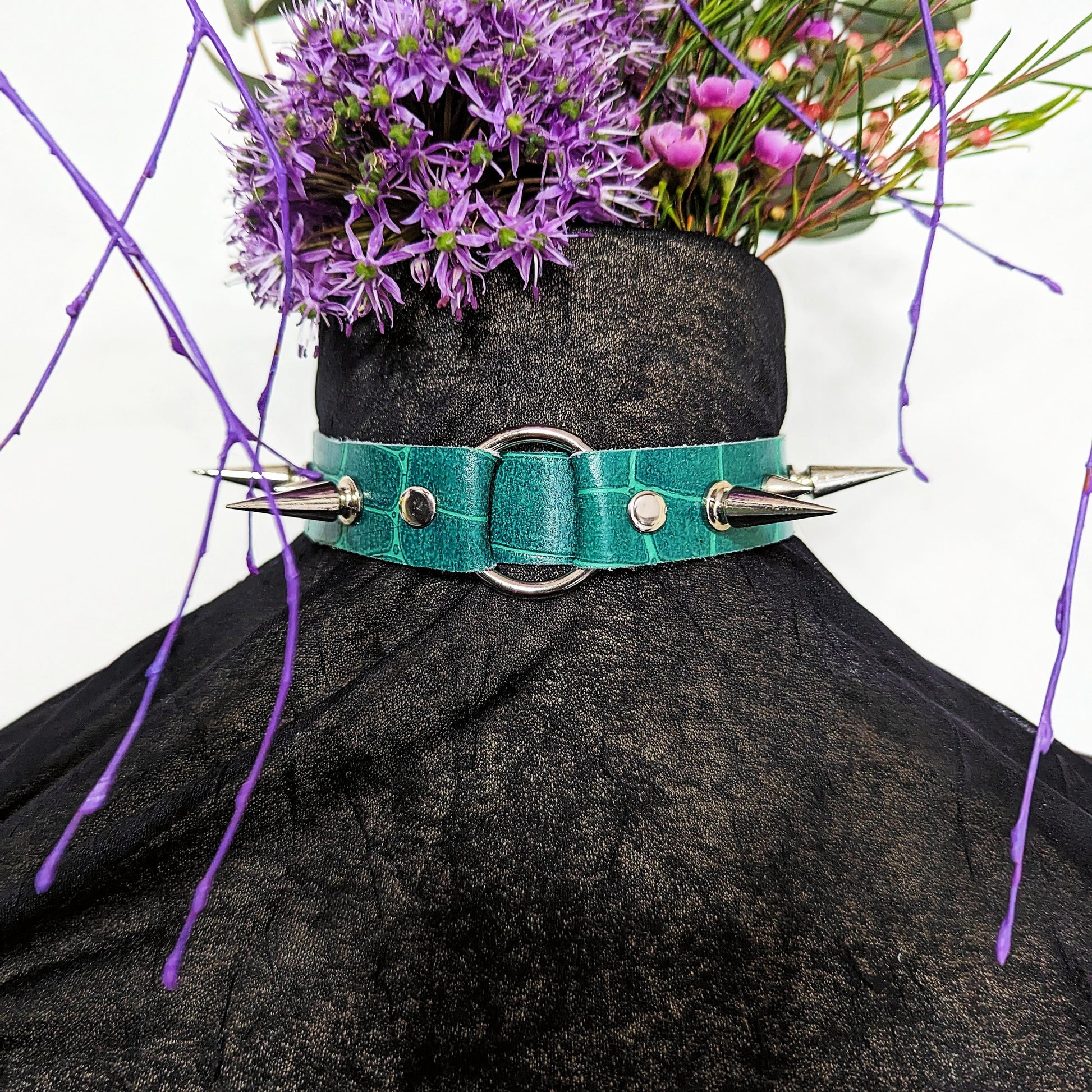 Arsenic / Paris green patent leather choker with croc embossing. Stainless steel o-rings, spikes, rivets, buckle and chain.