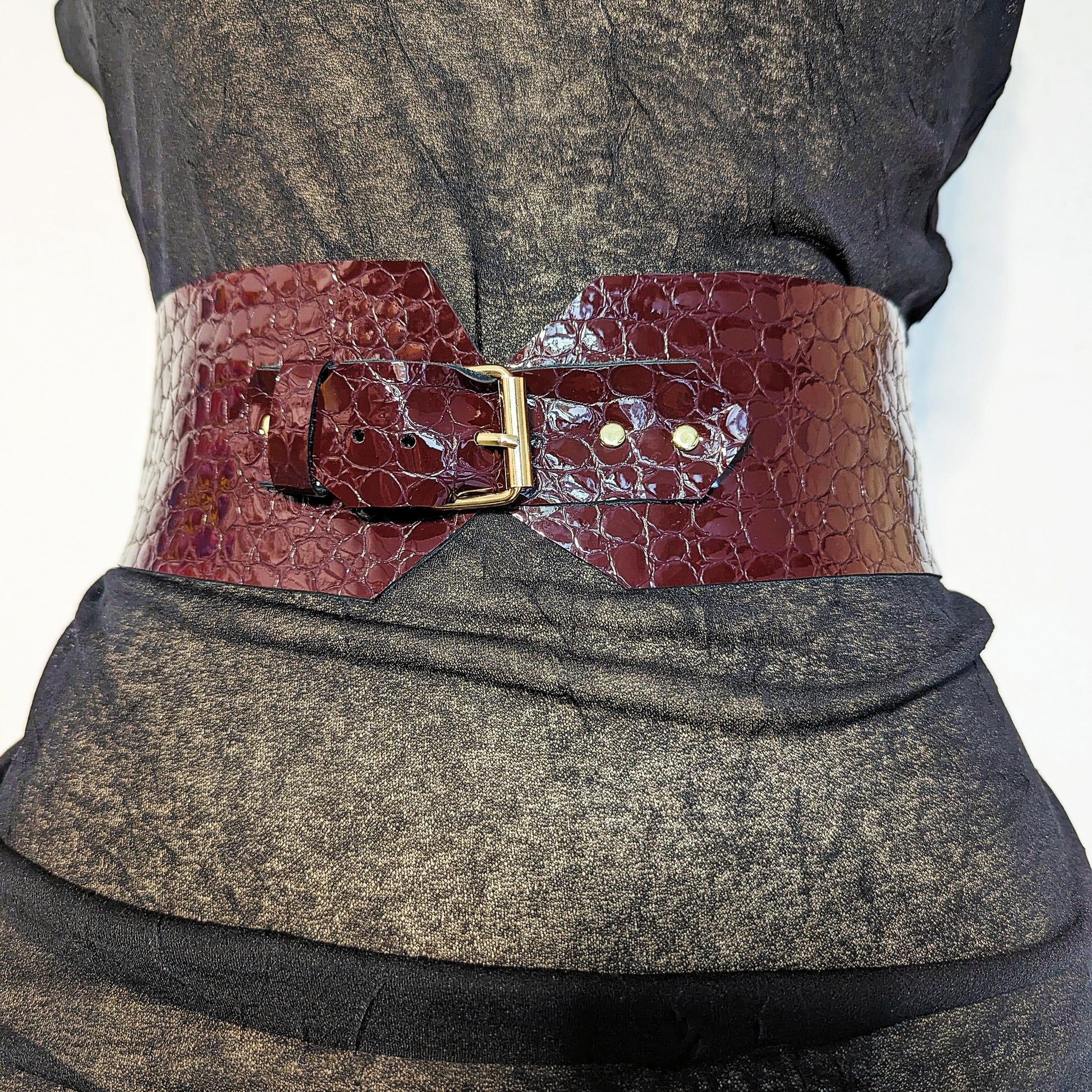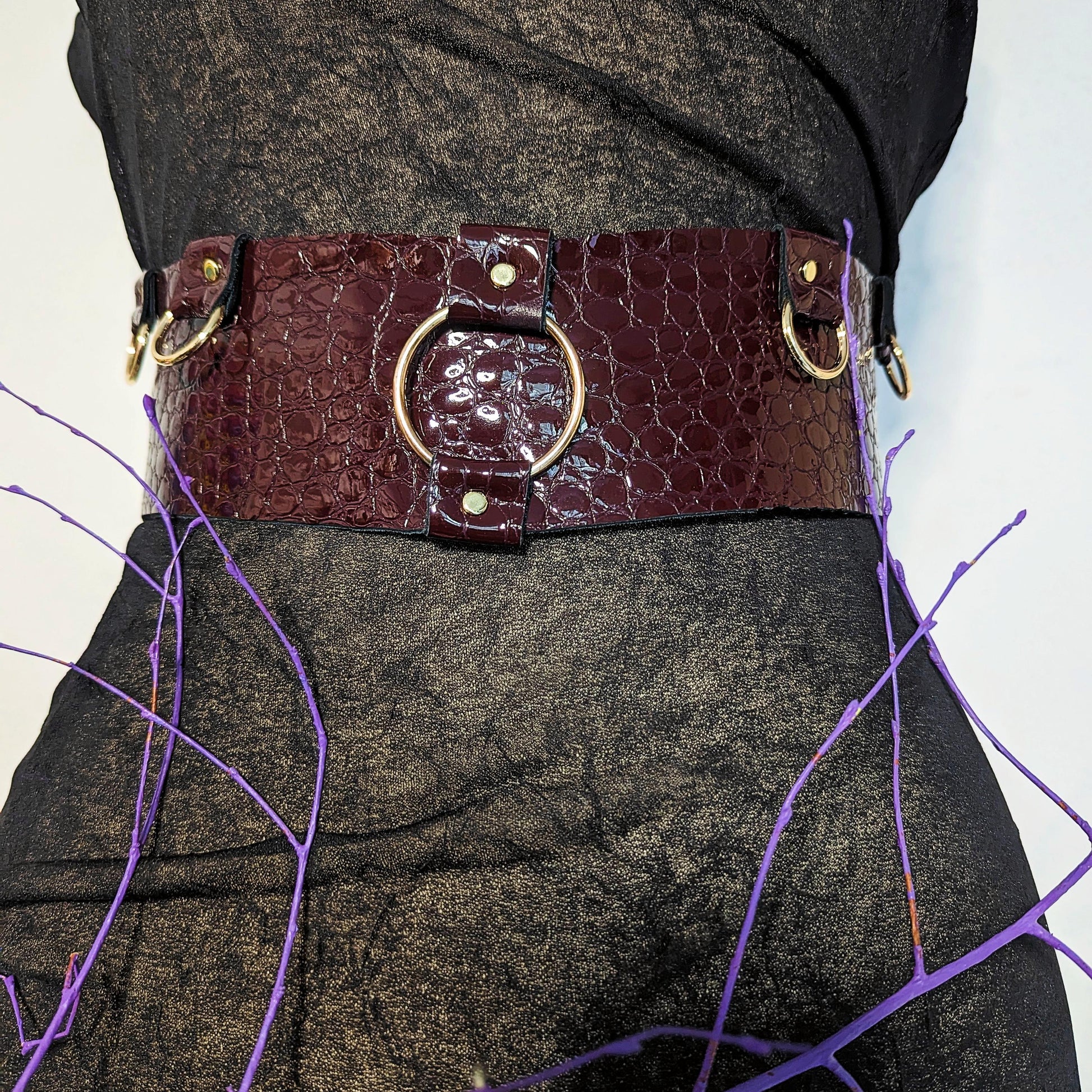 Blood, glossy and soft leather with cracked embossing. Gold-colored stainless steel o-rings, rivets & buckle. 8 cm broad and 1.5-2.1 mm leather thickness.