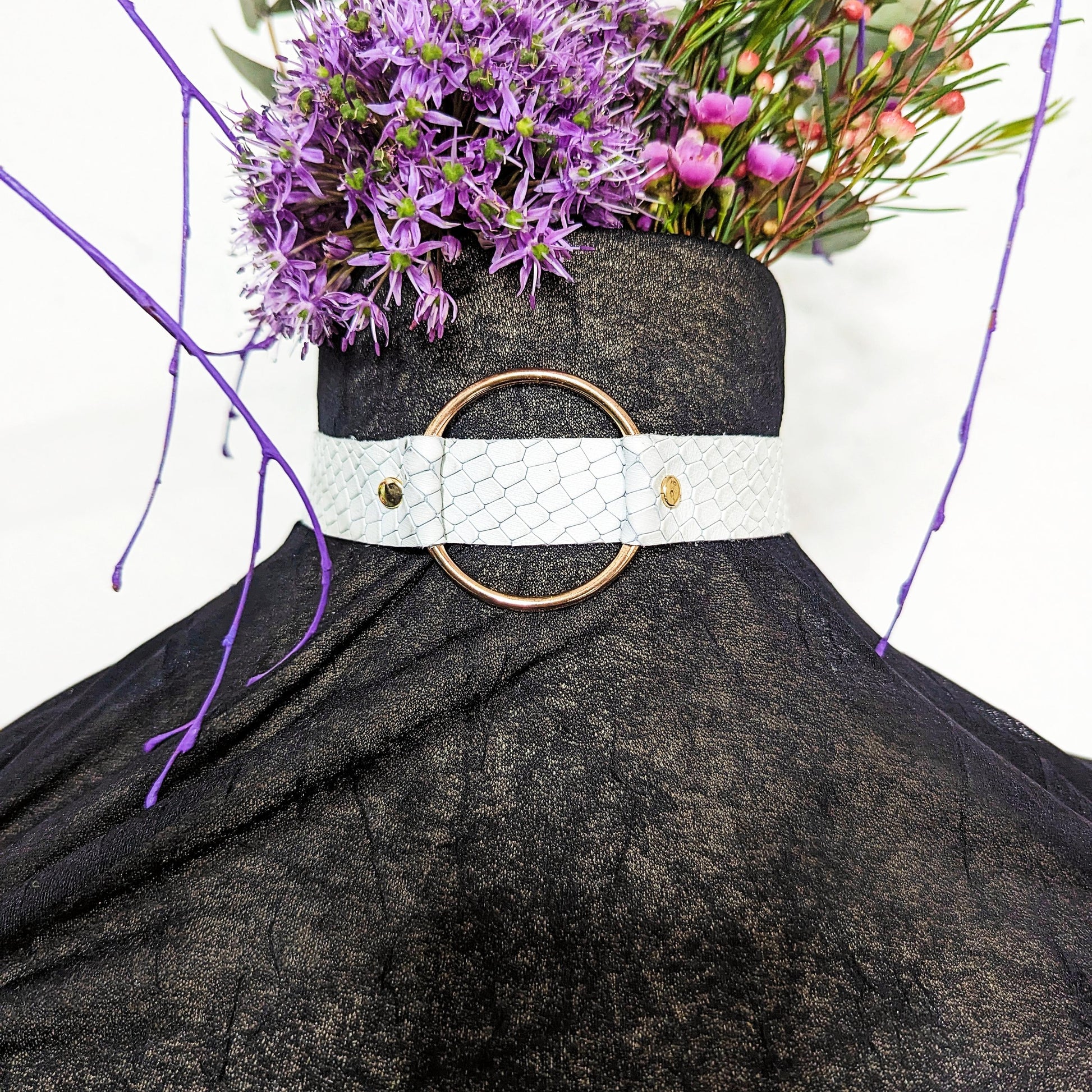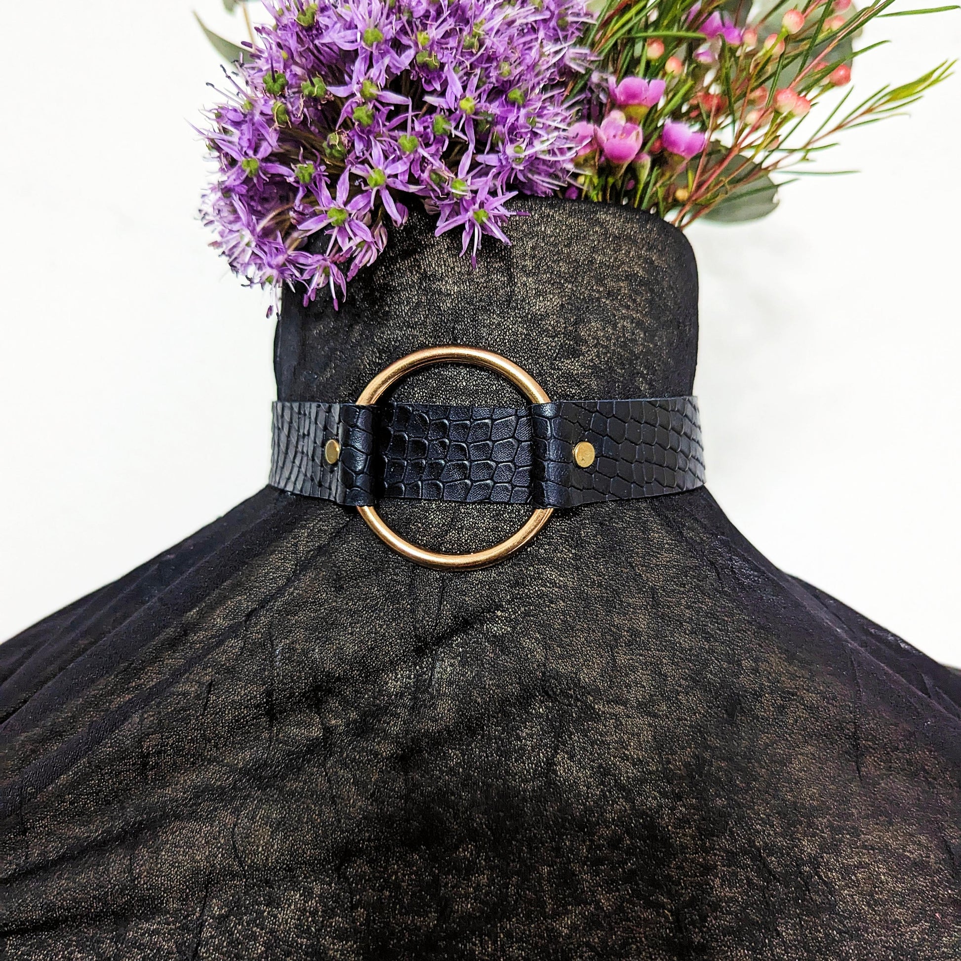 Matte, patent leather with snake scale embossing. Stainless steel o-ring, rivets and buckle.
