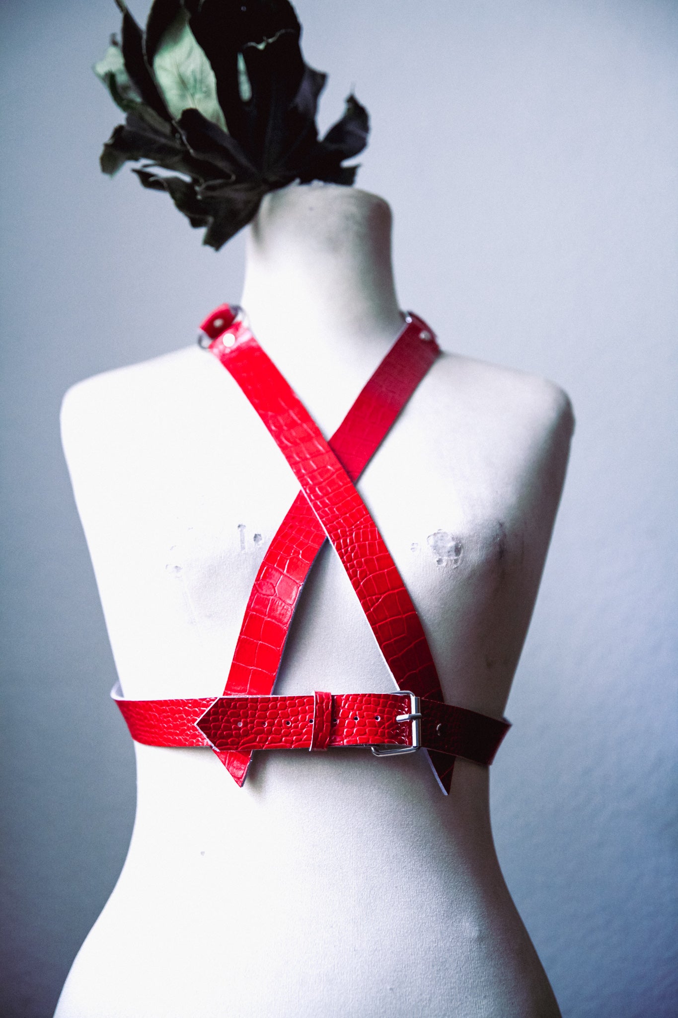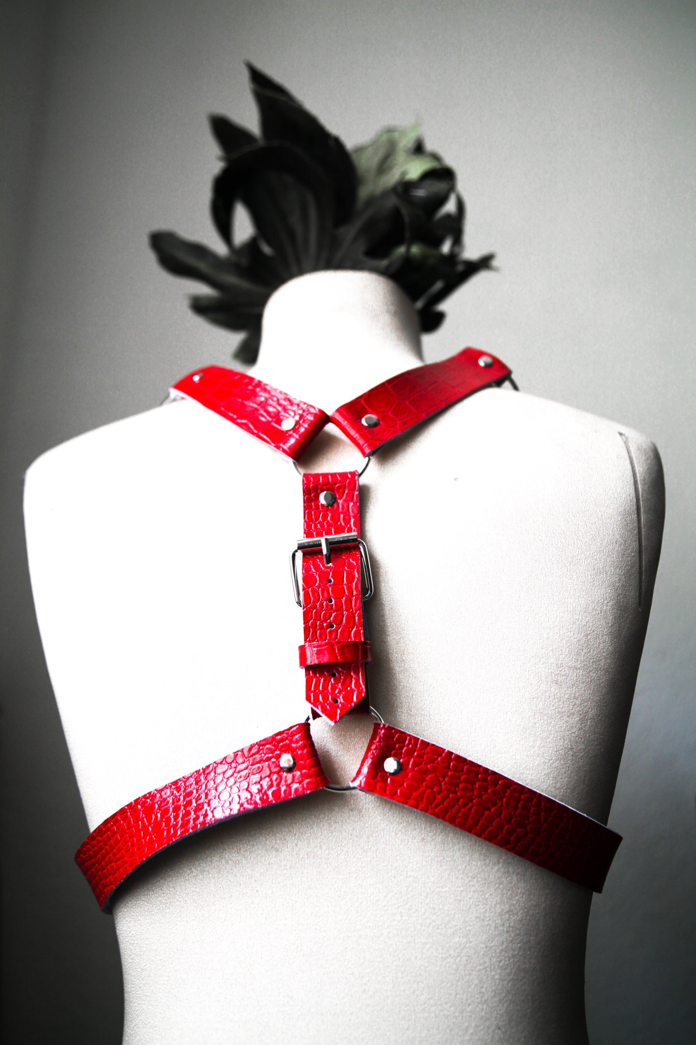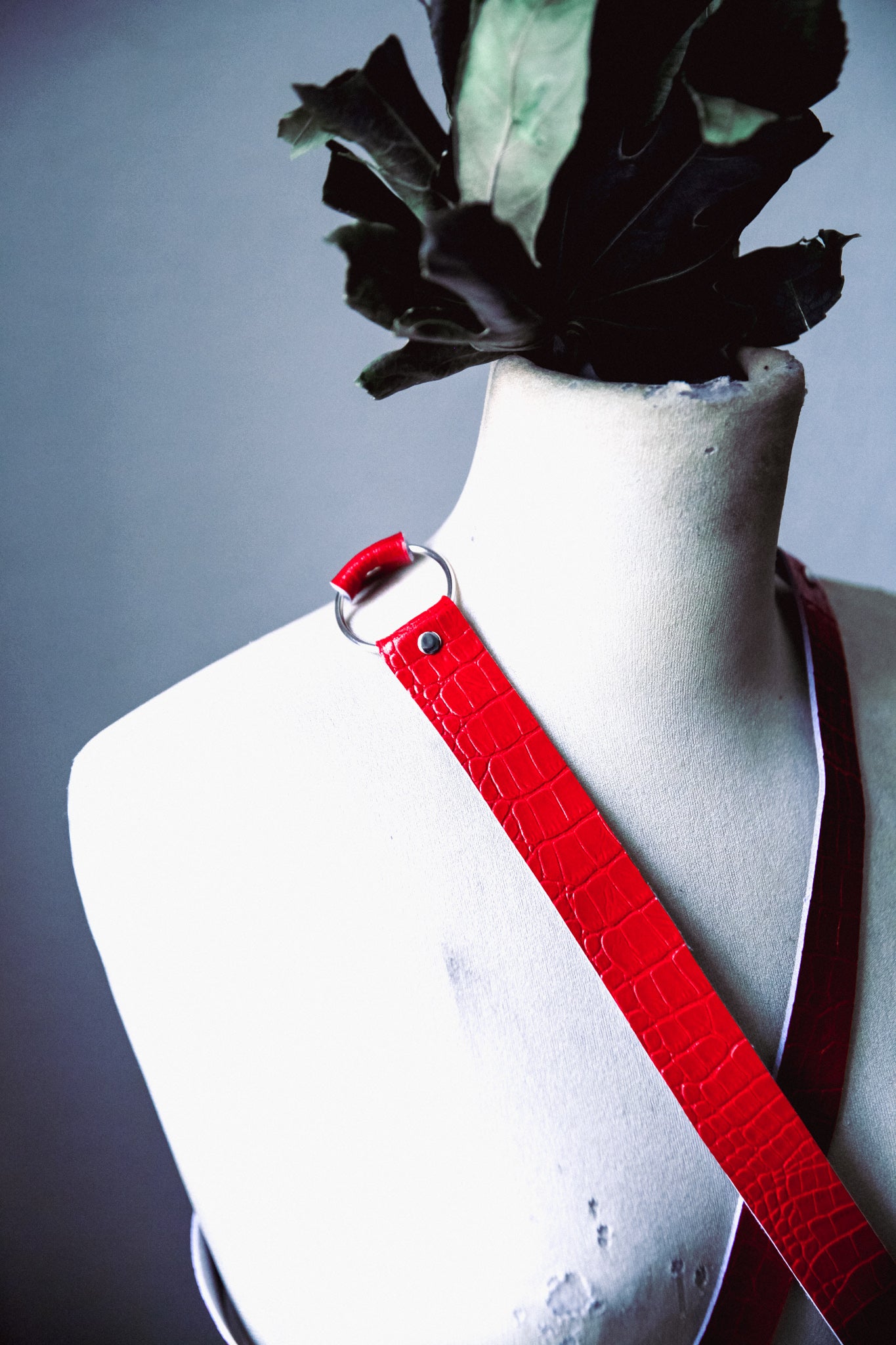 Shiny red leather with croc embossing. Silver-colored stainless steel o-rings, rivets and buckle. Very thick leather 2.5-3.5 mm.