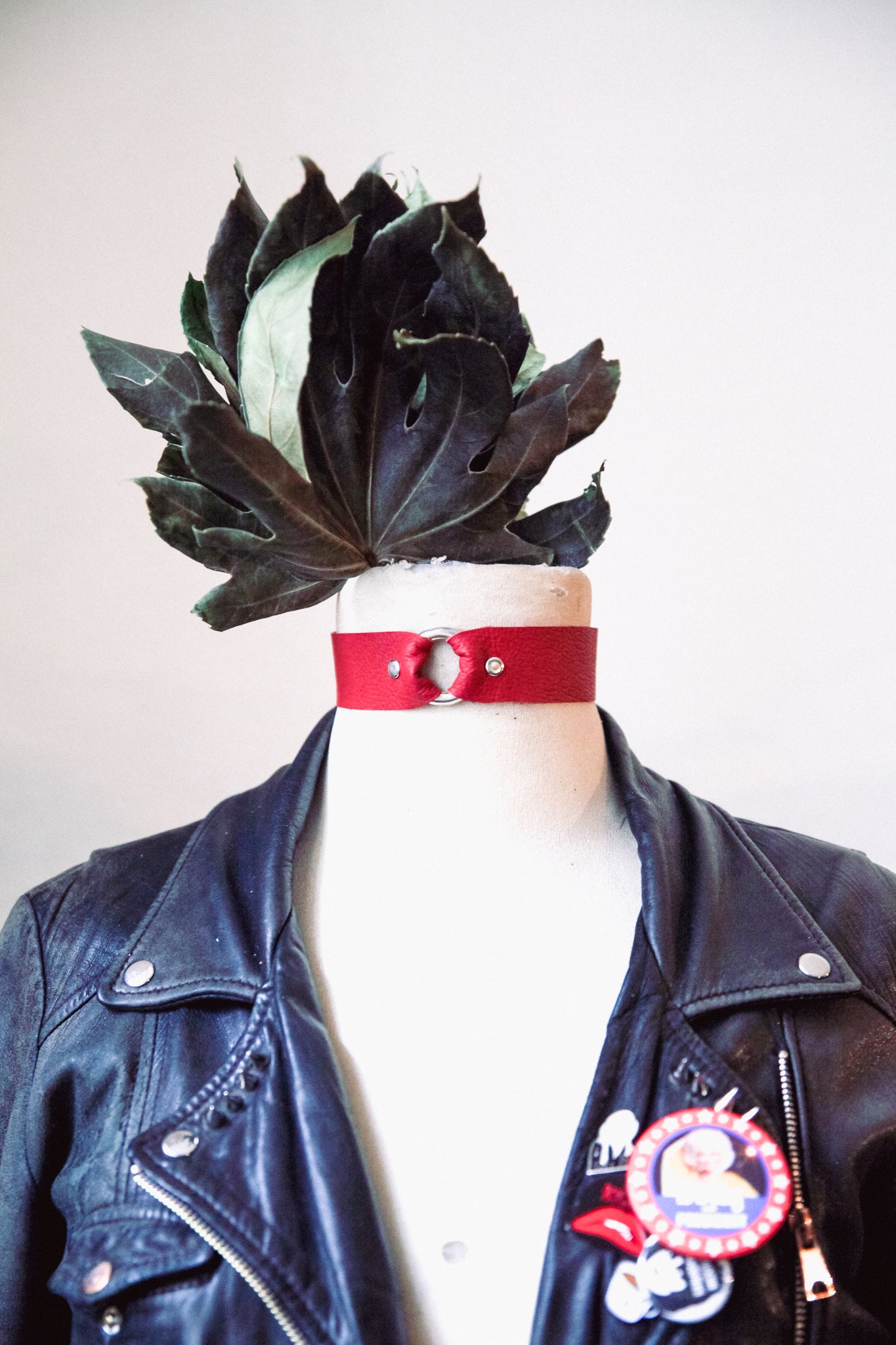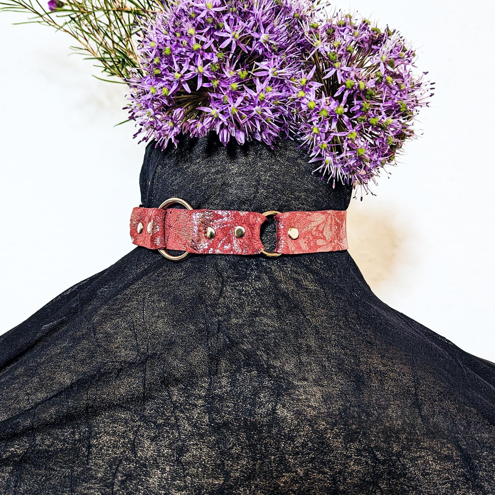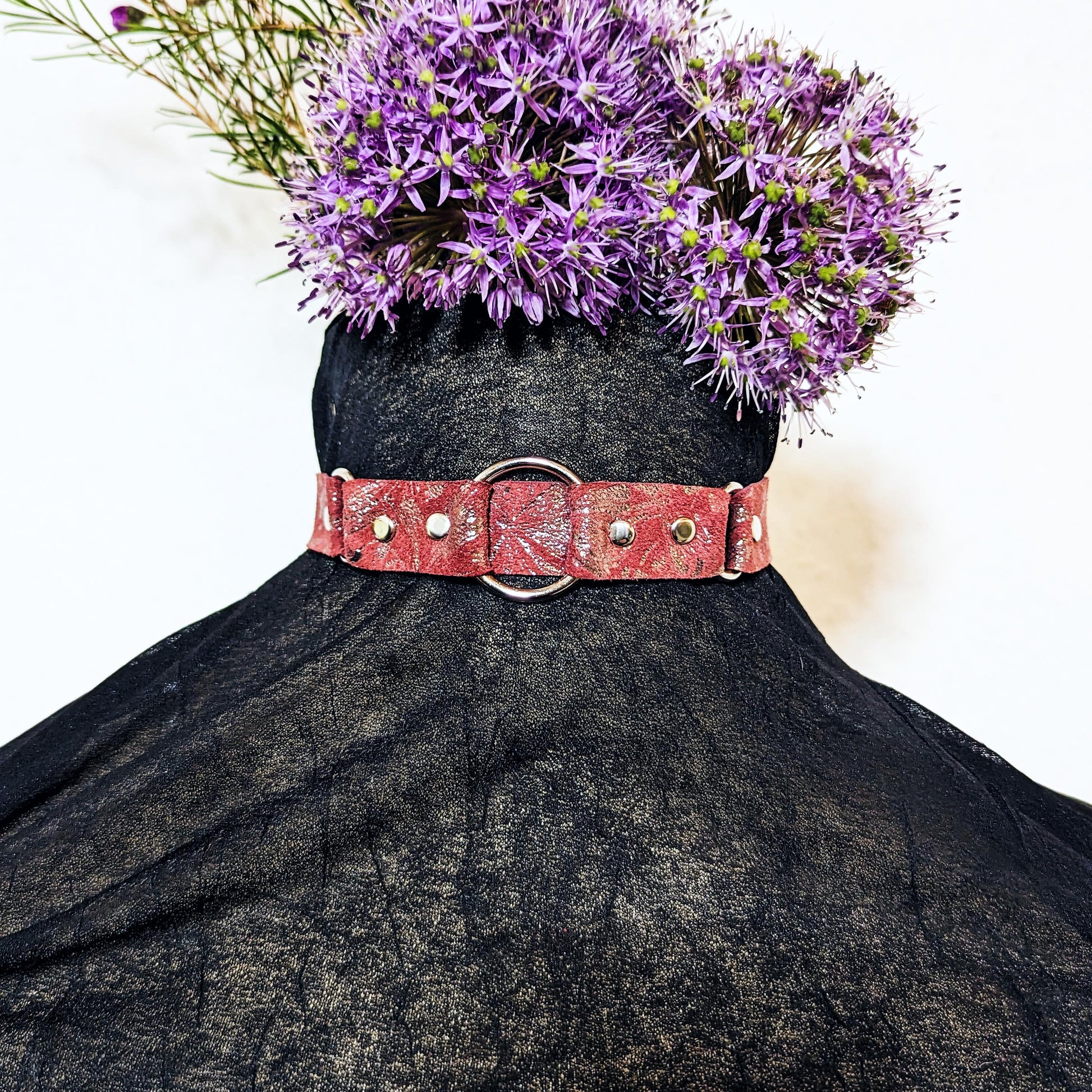 Soft leather with silver colored o-rings, d-rings, rivets and buckle.