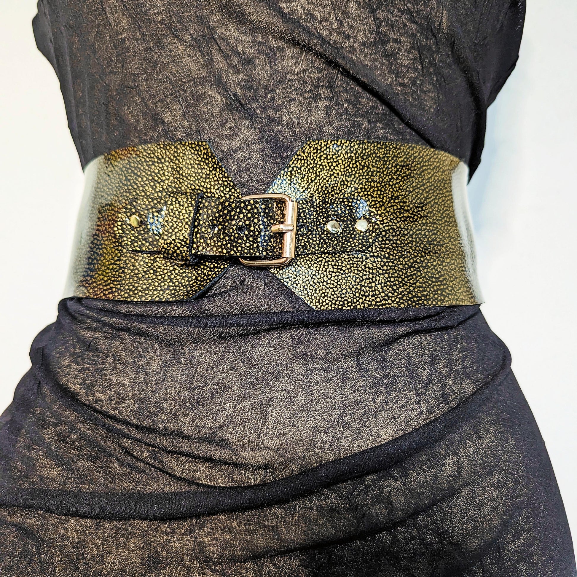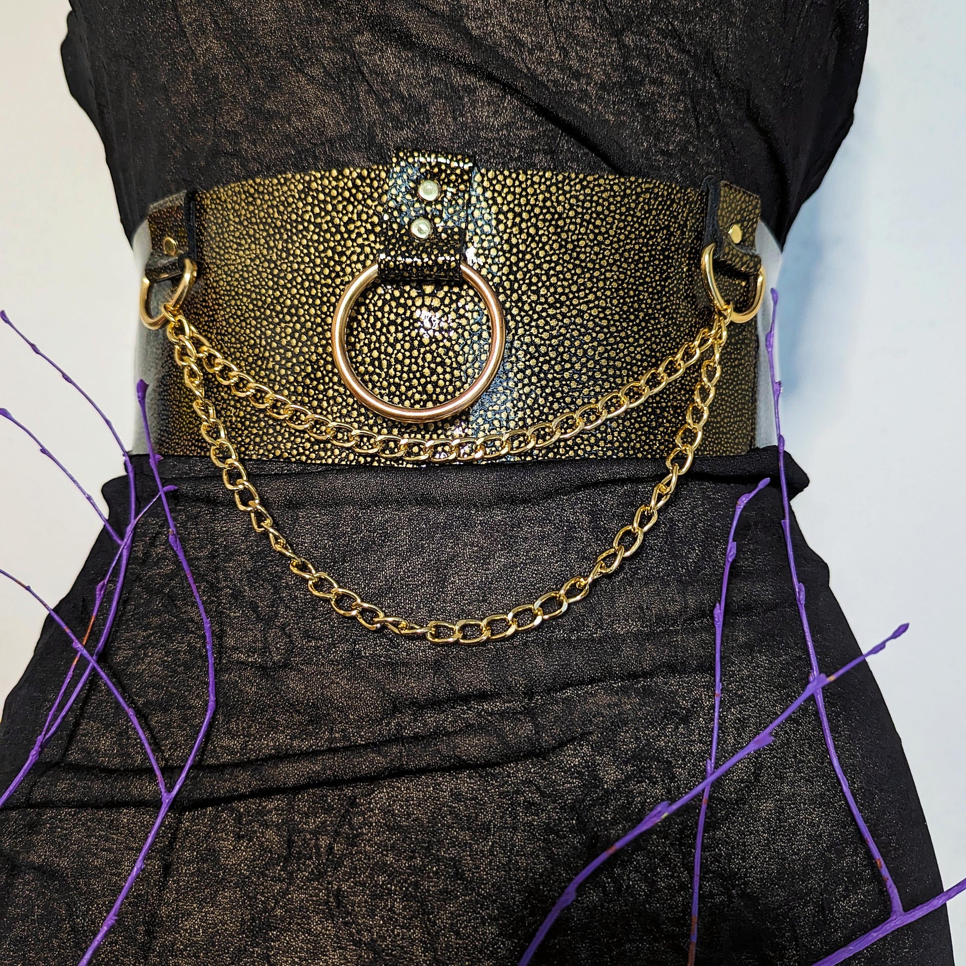 Black, glossy and soft leather with gold dots. Gold-colored stainless steel o-rings, rivets, buckle and chain. 8 cm broad and 1.5-2.1 mm leather thickness.