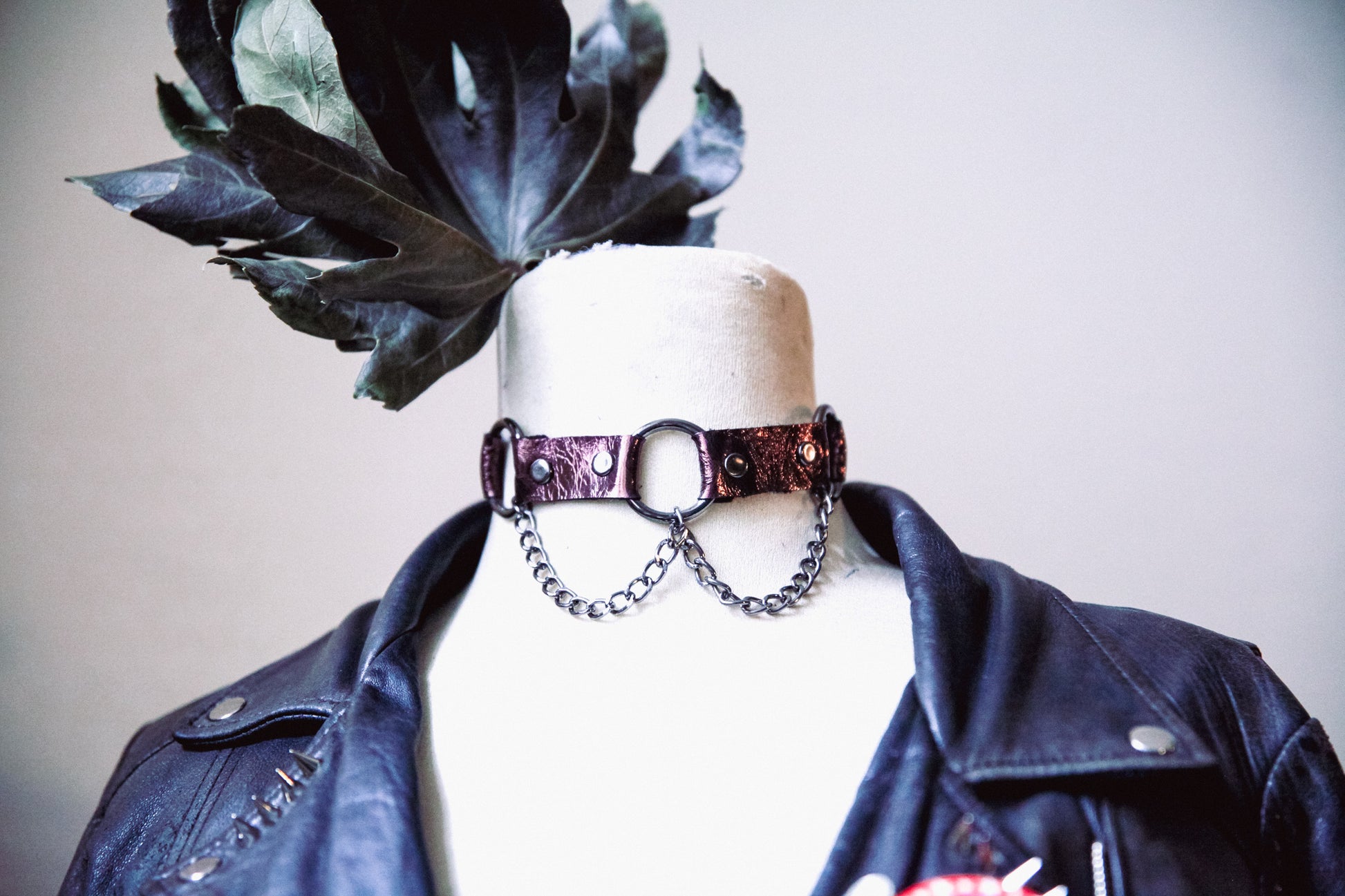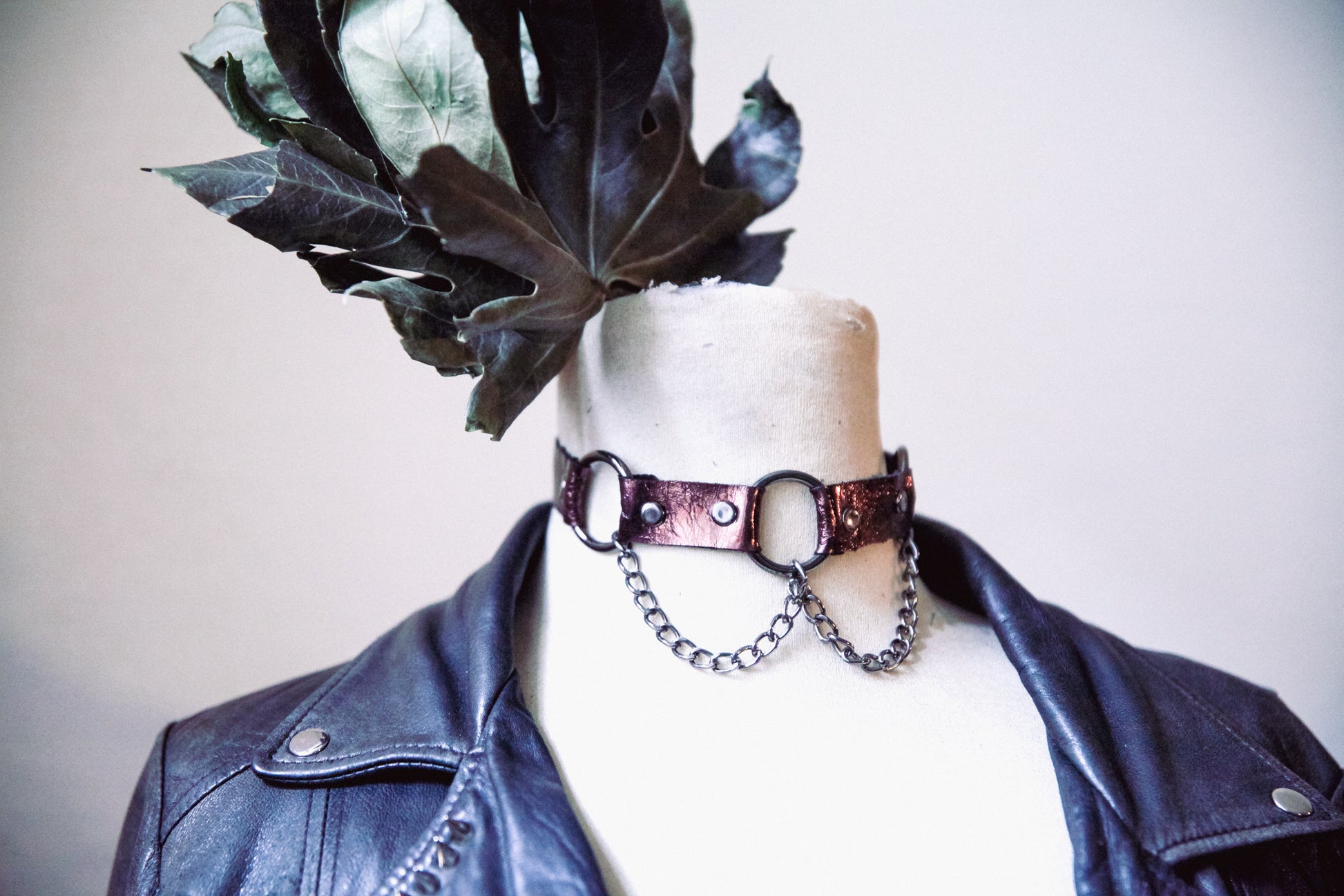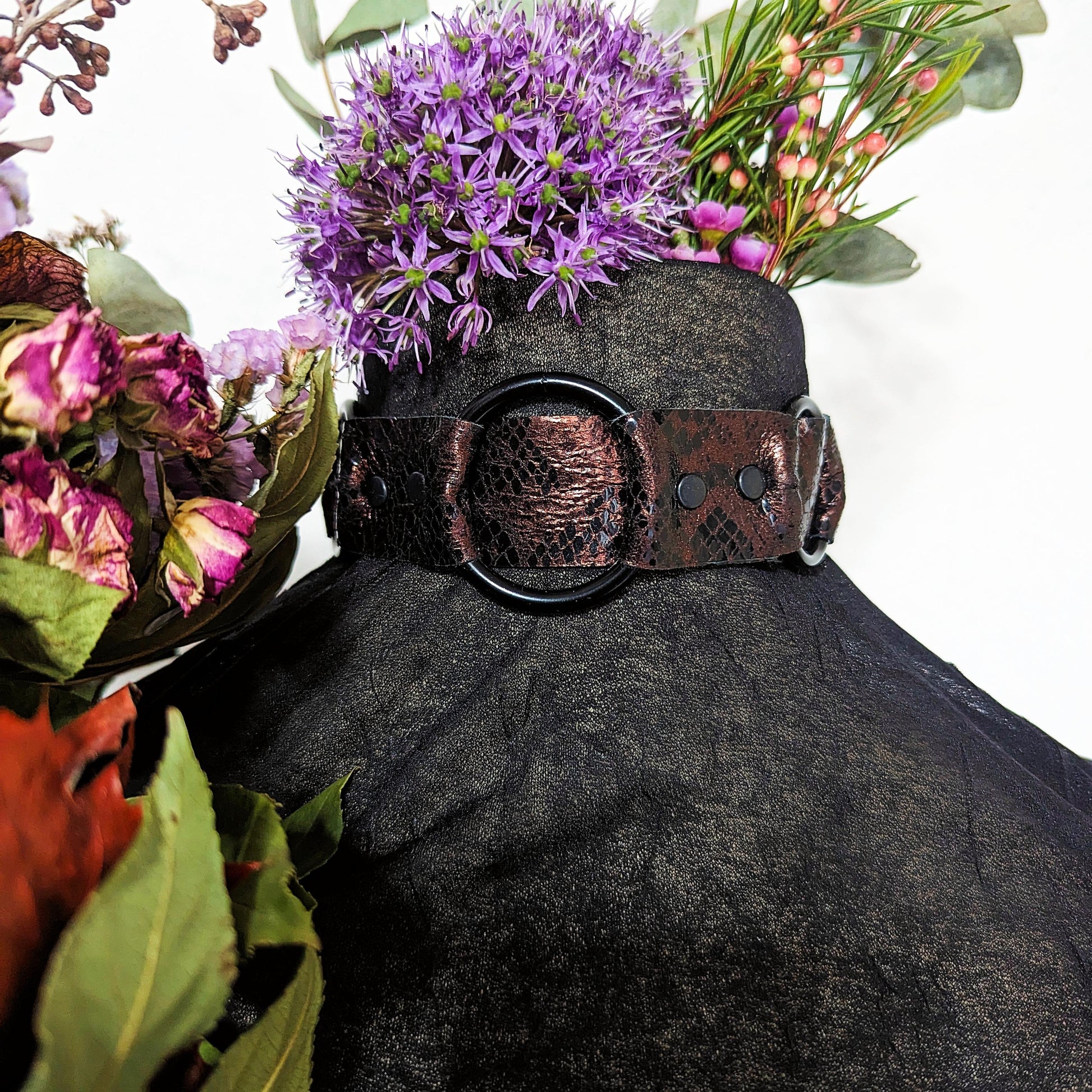 This new romantics choker is made from metallic blood colored, shiny patent leather (medium soft) Stainless steel d- and o-rings, rivets and buckle in charcoal color.