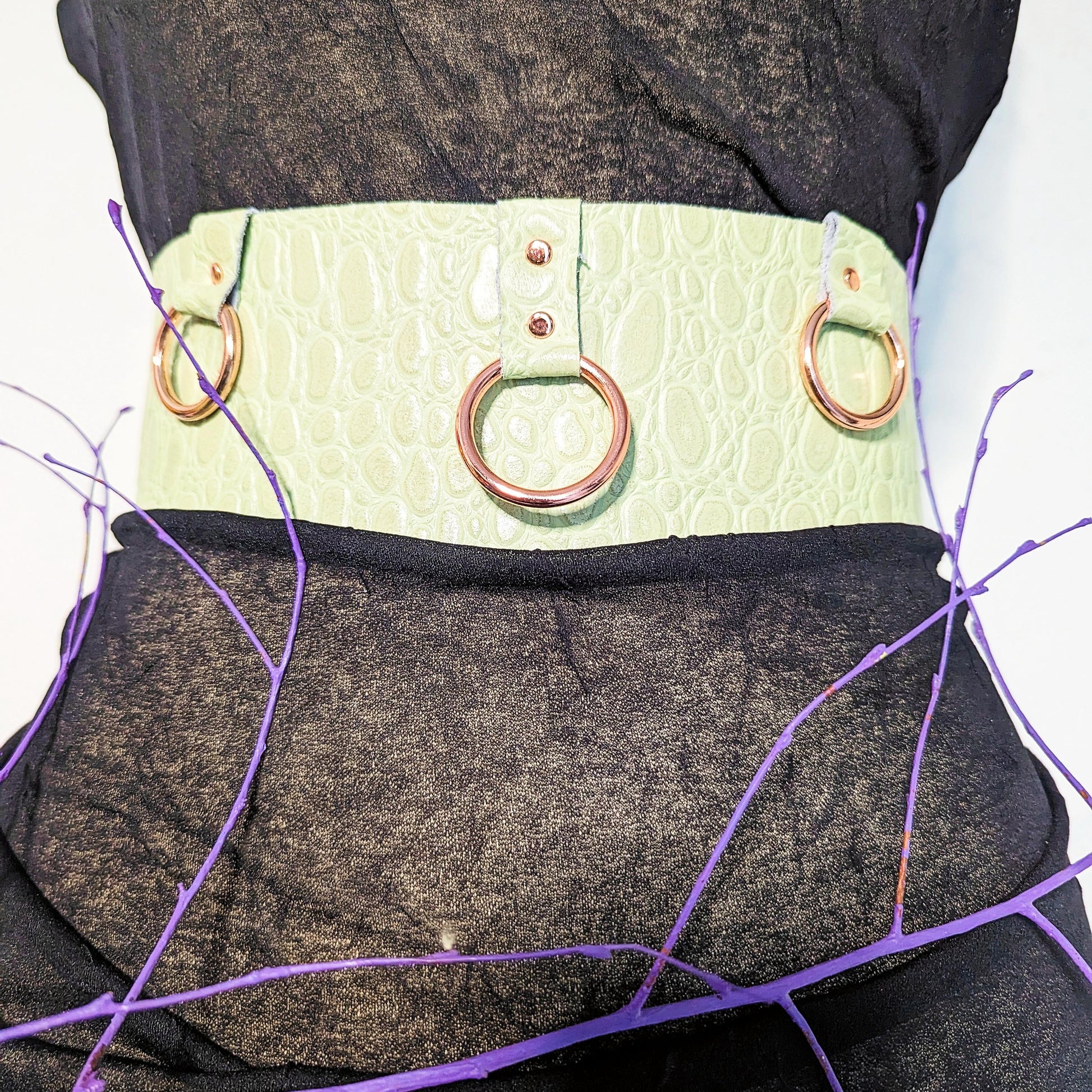 Light green patent leather with croc embossing. Rosé colored o-ring, rivets and buckle.