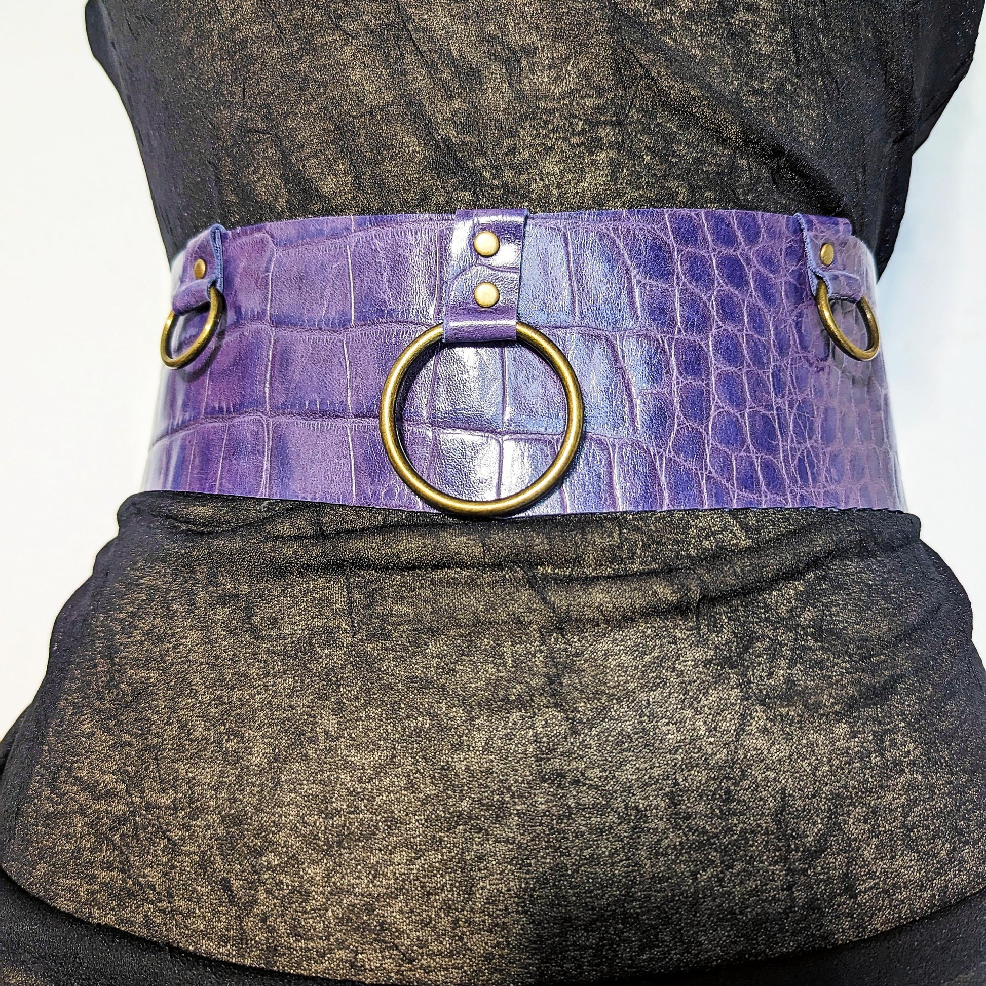 Purple leather with croc embossing. Dark Gold-colored stainless steel o-rings, rivets and buckle. 8 cm broad and 1.5-2.1 mm leather thickness.