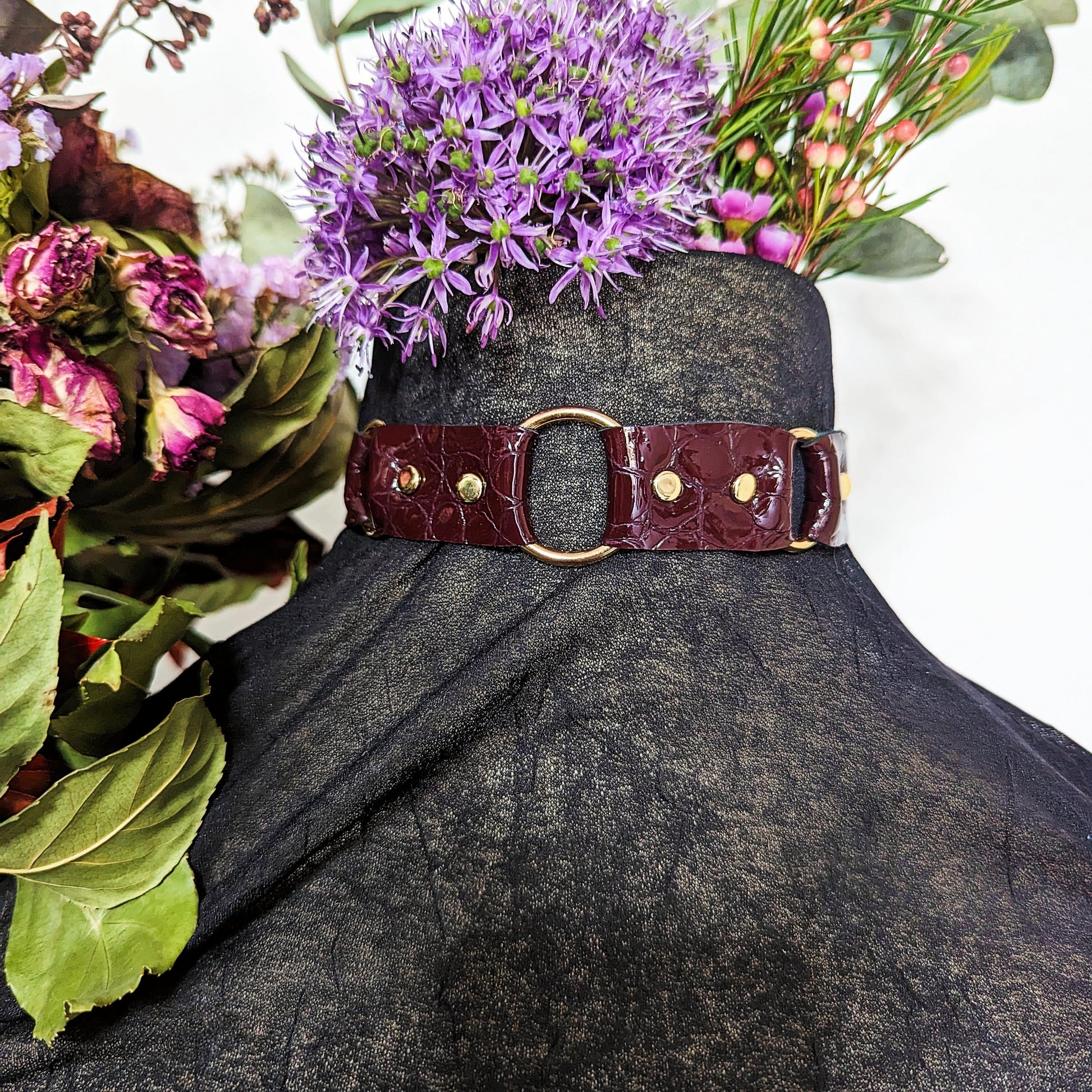 Blood, glossy and soft leather with cracked embossing. Gold-colored stainless steel o-rings, rivets & buckle.