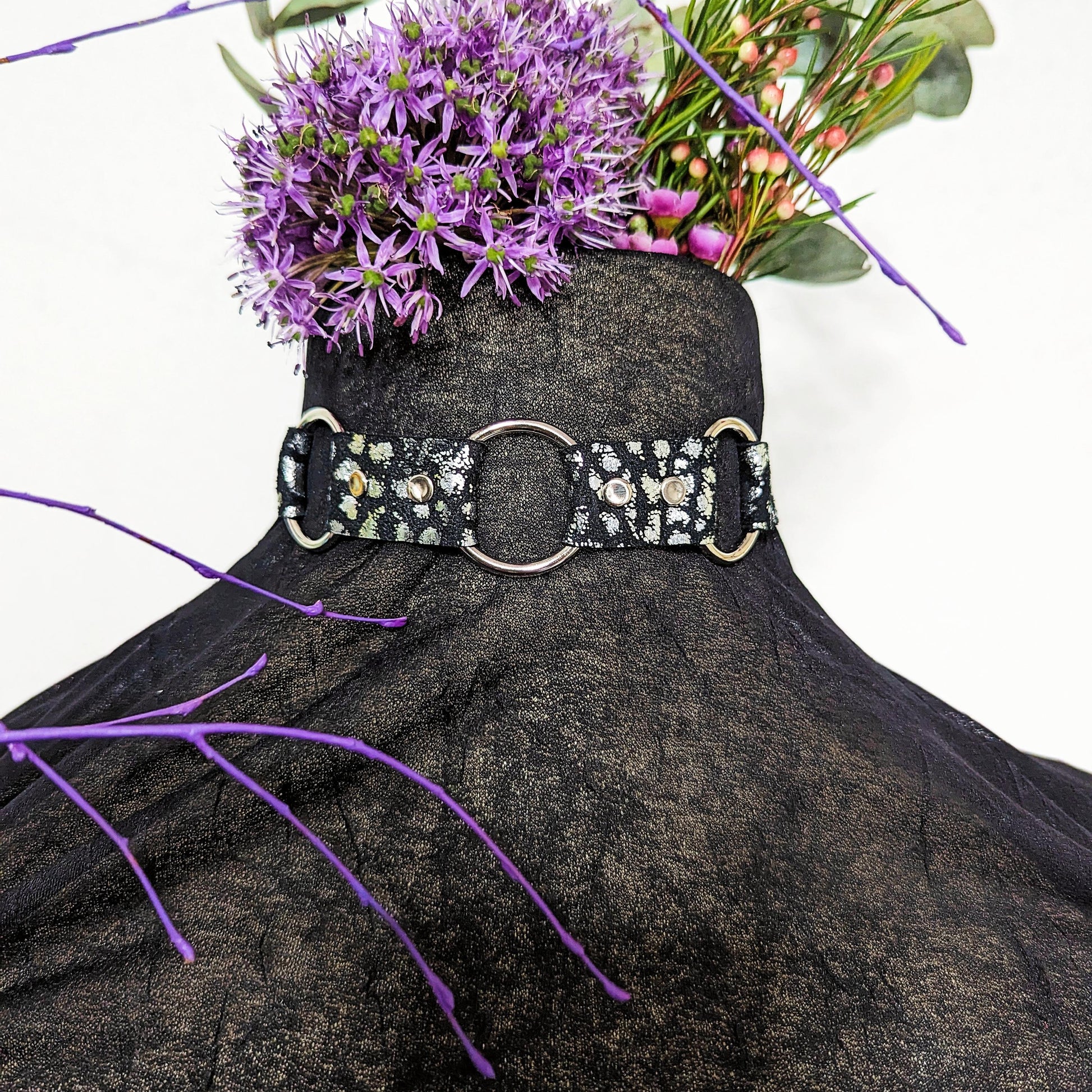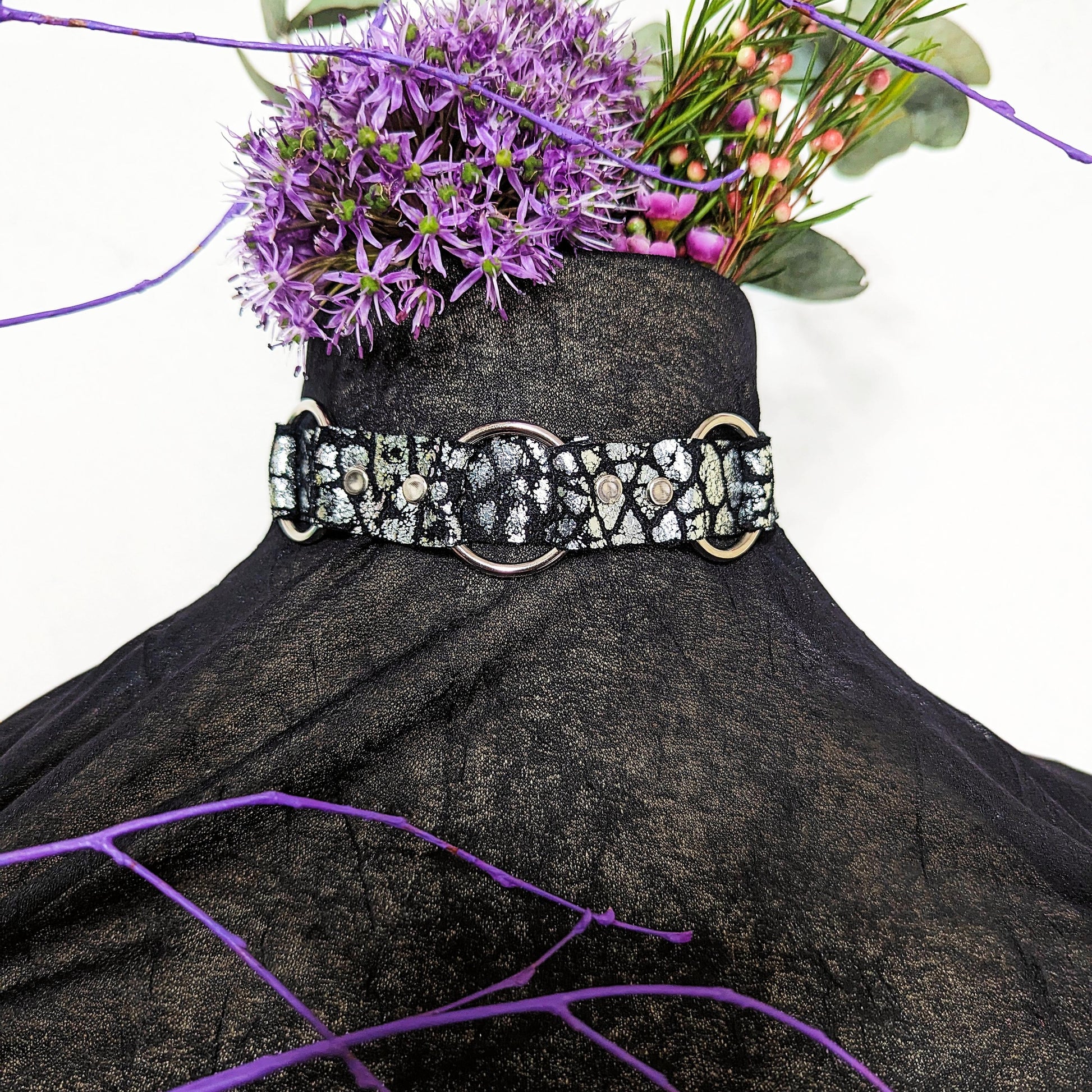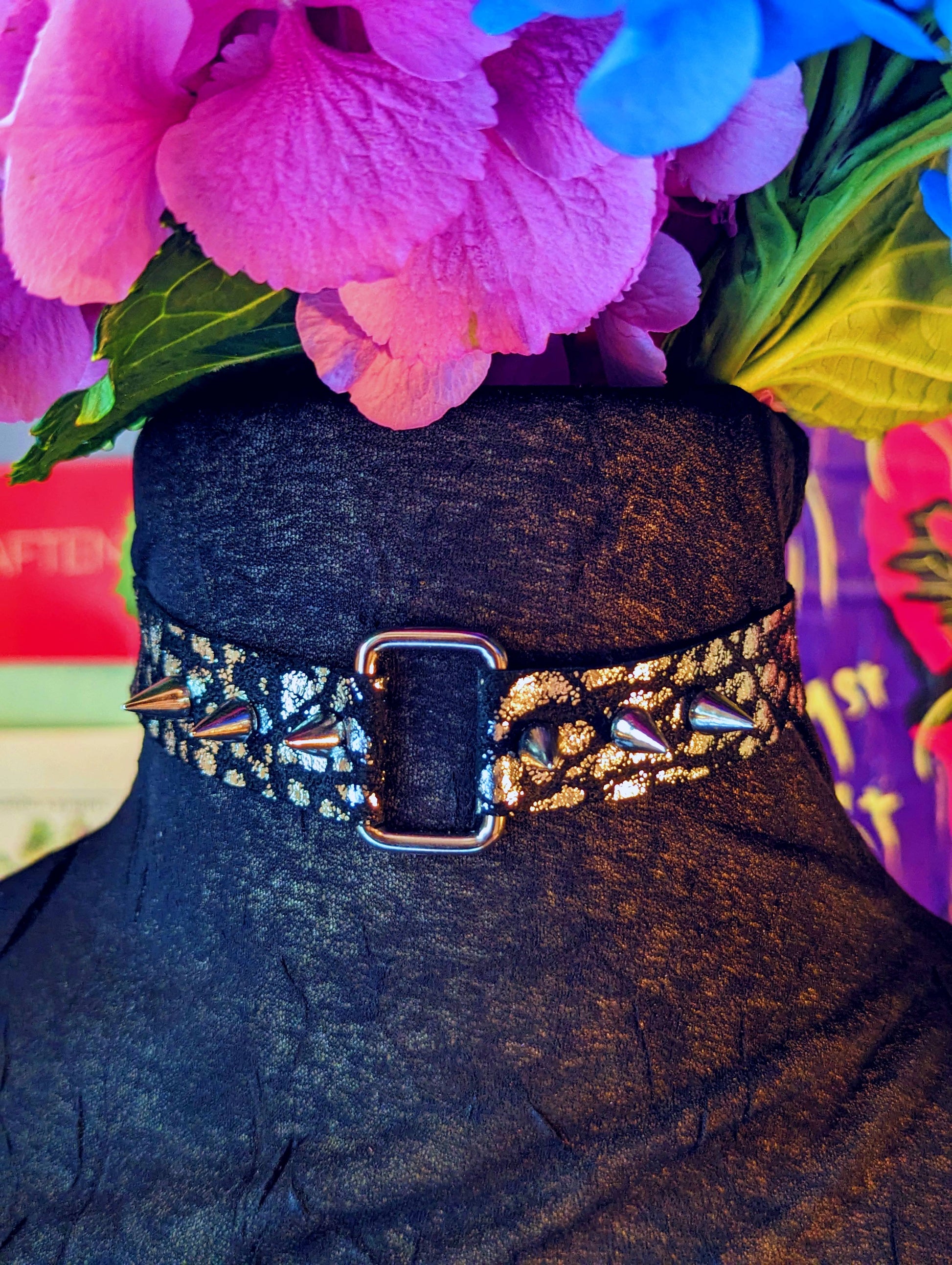 Soft, black leather with snake silver paint print. Stainless steel silver colored rings, rivets, buckle and spikes.