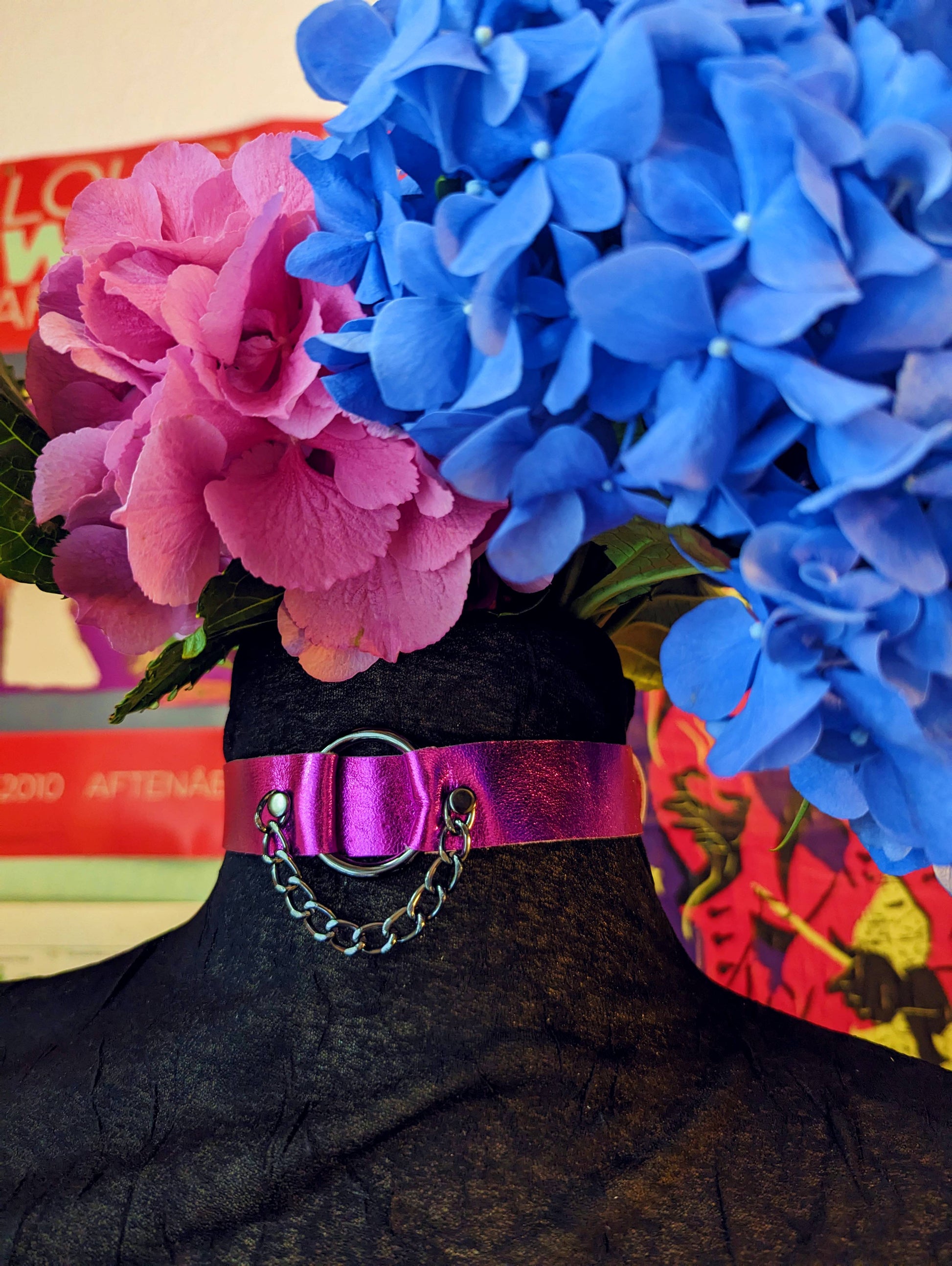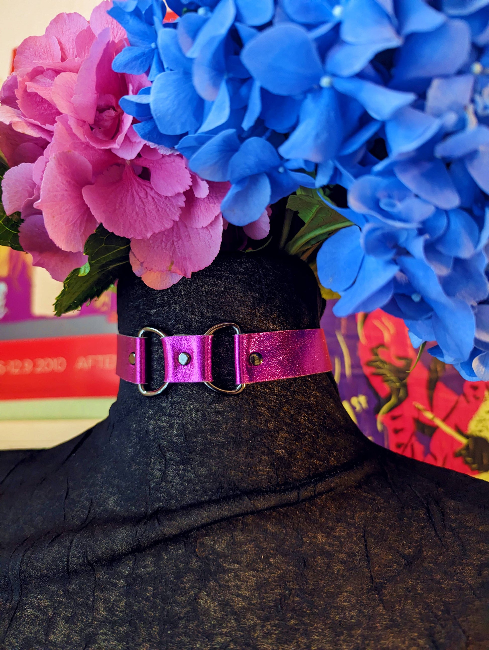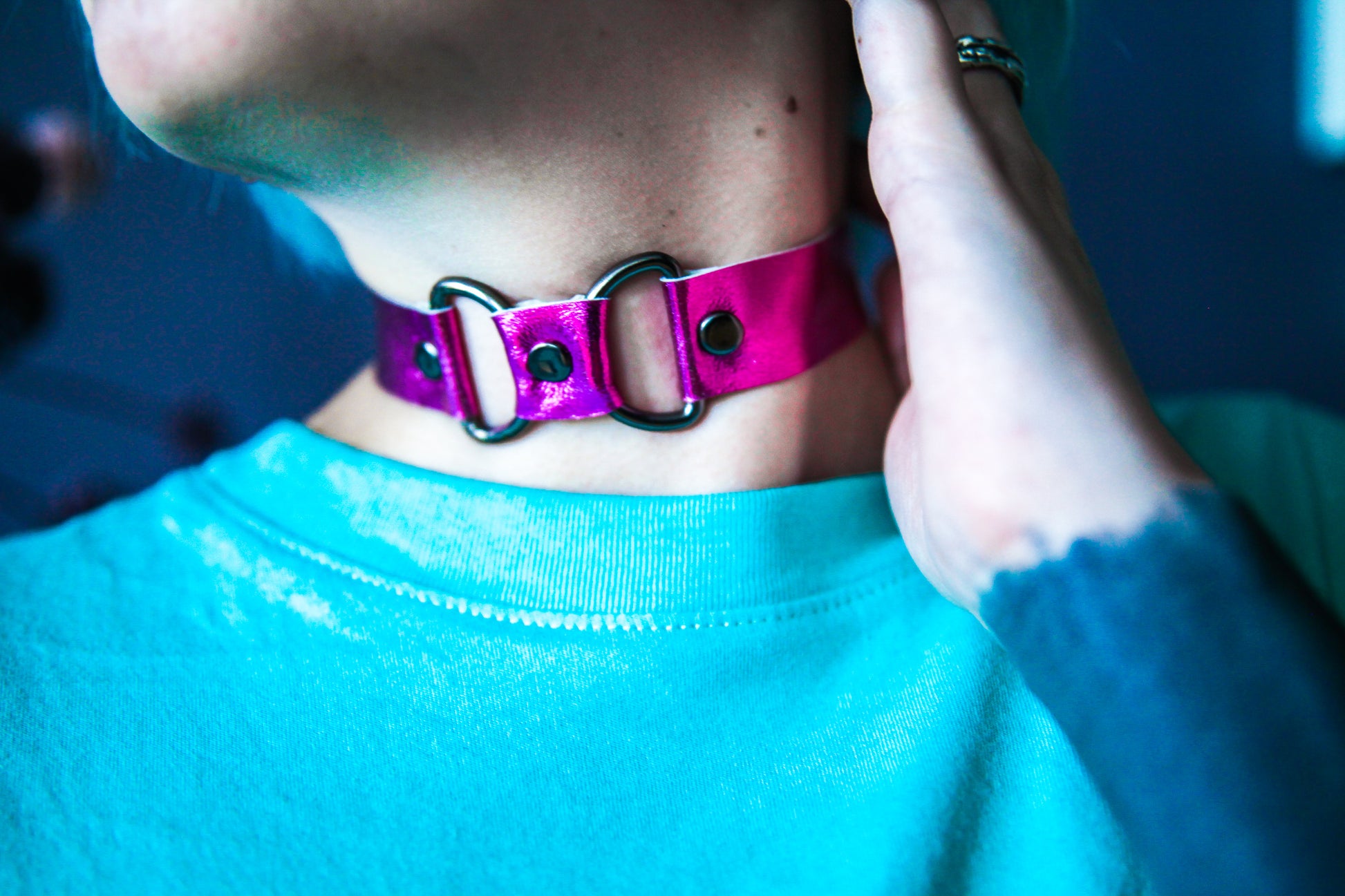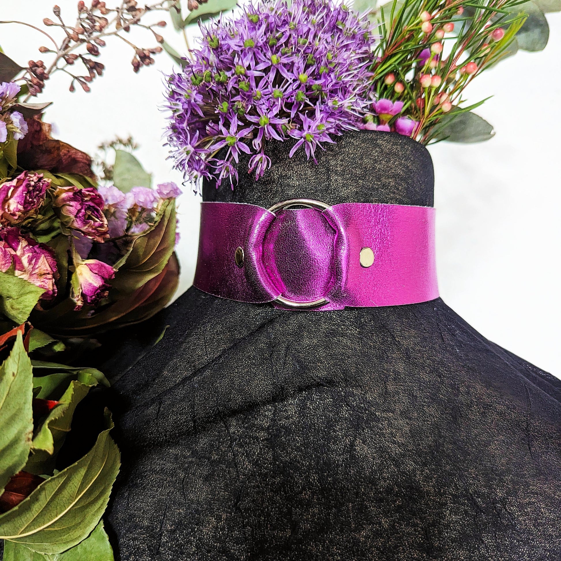 This choker extravaganza is made from metallic pink patent leather (medium soft) Stainless steel d- and o-rings, rivets and buckle in charcoal color.