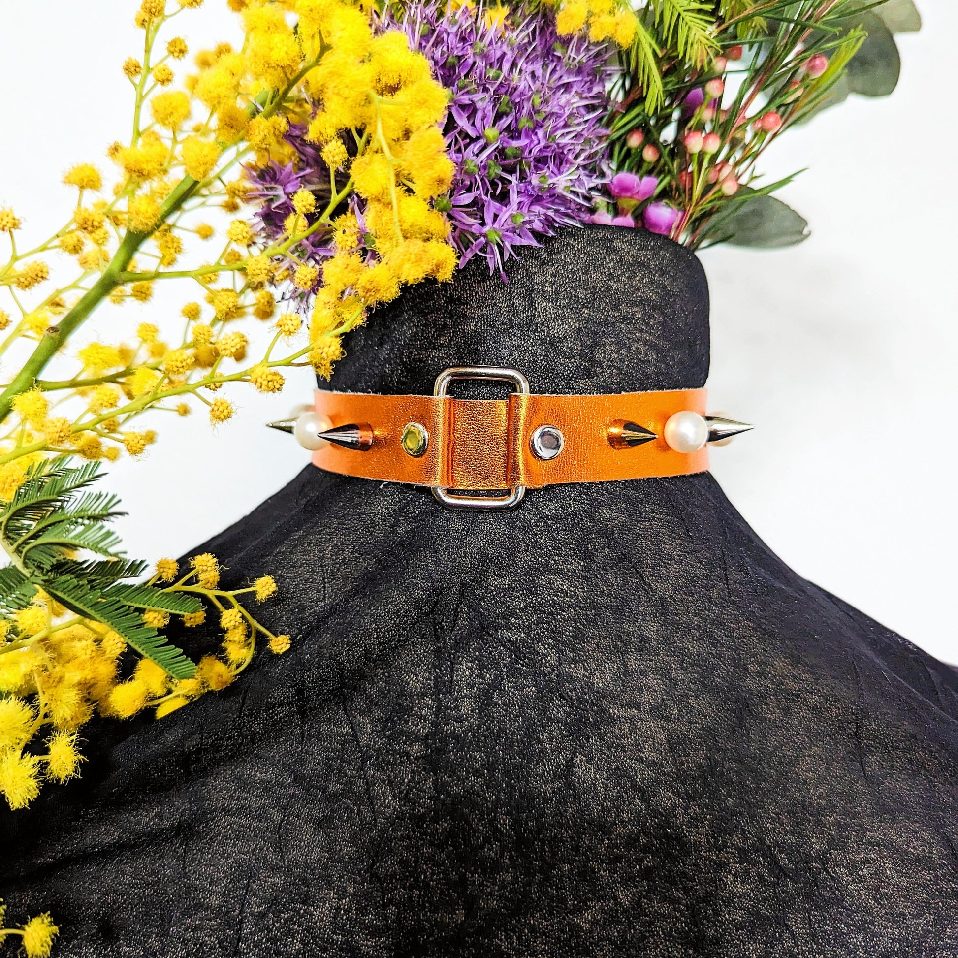 This roaring choker is made from metallic orange patent leather (medium soft) Stainless steel square-ring, rivets, buckle, spikes and acrylic pearls.